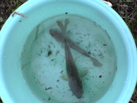 夕方、近所の用水路へ釣りに行きました。 稲刈りの最盛期であり、 用水路にはほとんど水がありません。 1時間ほどで、なんとか長男と私で2匹のコイを 釣り上げました。 次男はめずらしくボウズでした、 今日は次男くん誕生日だったのに残念です。 |