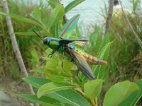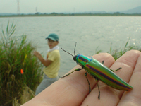 またまたテナガエビ釣りに行ってきました。 釣果は、ハゼ普通サイズが4匹、ミニサイズ4匹、テナガエビは2匹と散々でした。 釣りはダメでしたが、なんとタマムシが翔んできました! 今どきかなり珍しい昆虫ではないでしょうか? 右下の写真では、何度も飛び上がりにミスして撮影チャンスをくれました。 今日はこれだけでもココに来た甲斐がありました。 |